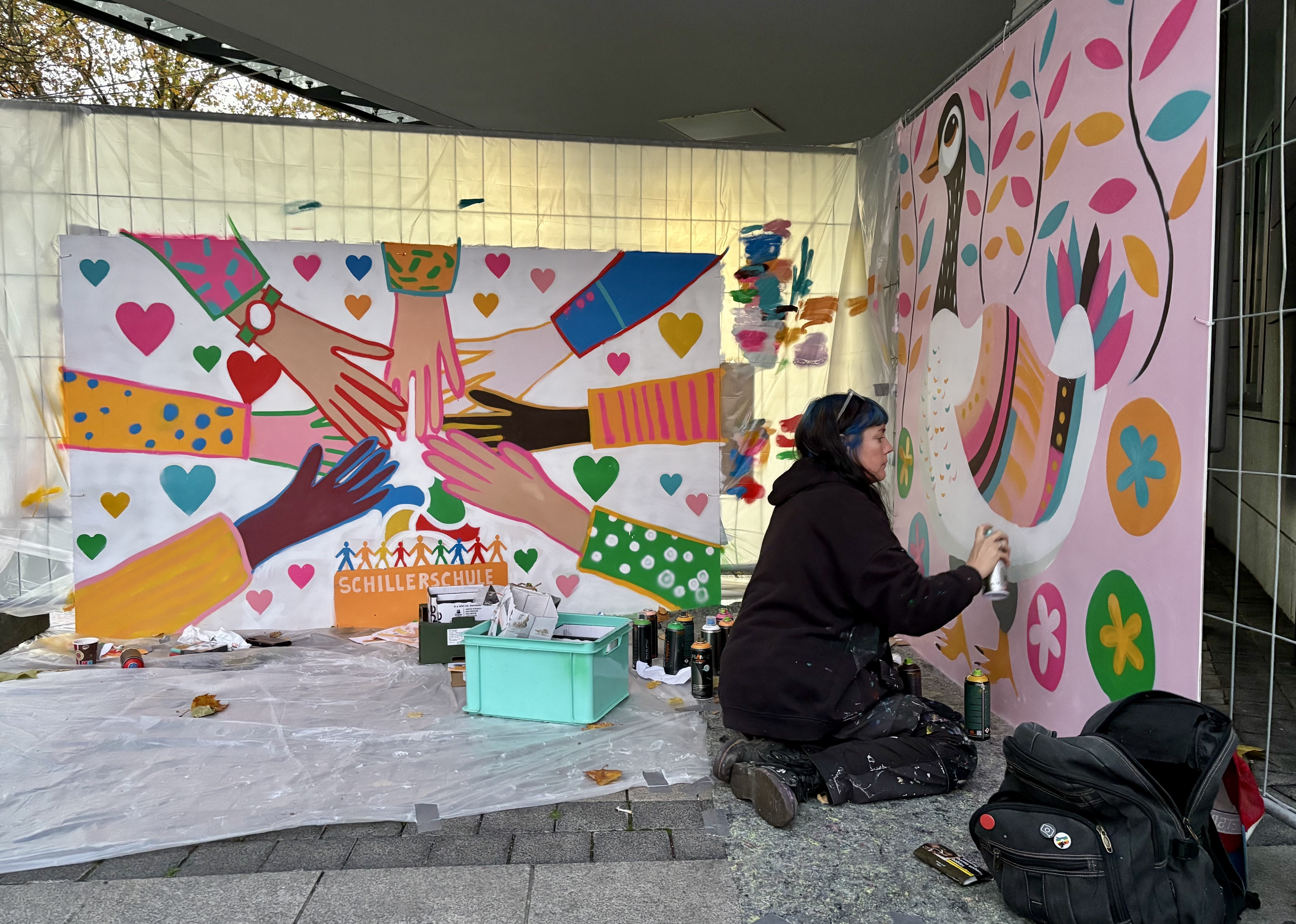 Zum Gänsemarkt war die Künstlerin Candy Joyce zu Gast, die bereits zum Festival Mitten in Europa mit zwei Künstlern die ehemalige Turmstation der Stadtwerke in der Aspacher Straße gestaltete. In diesem Jahr fertigte sie zusammen mit Kindern der vierten Klassen der Schillerschule zwei große Wandgemälde. Das eine zeigt das Logo der Schillerschule, das andere passend zum Gänsemarkt eine farbenfrohe Gans. Die zwei Wandgemälde werden in der Schillerschule aufgehängt. Auch die Besucher des Gänsemarkts konnten aktiv werden und das Bild zum Gänsemarkt gestalten. Wir danken der Stadt Backnang für die finanzielle Unterstützung dieses Partnerschaftsprojekts. |